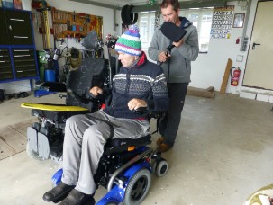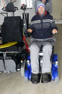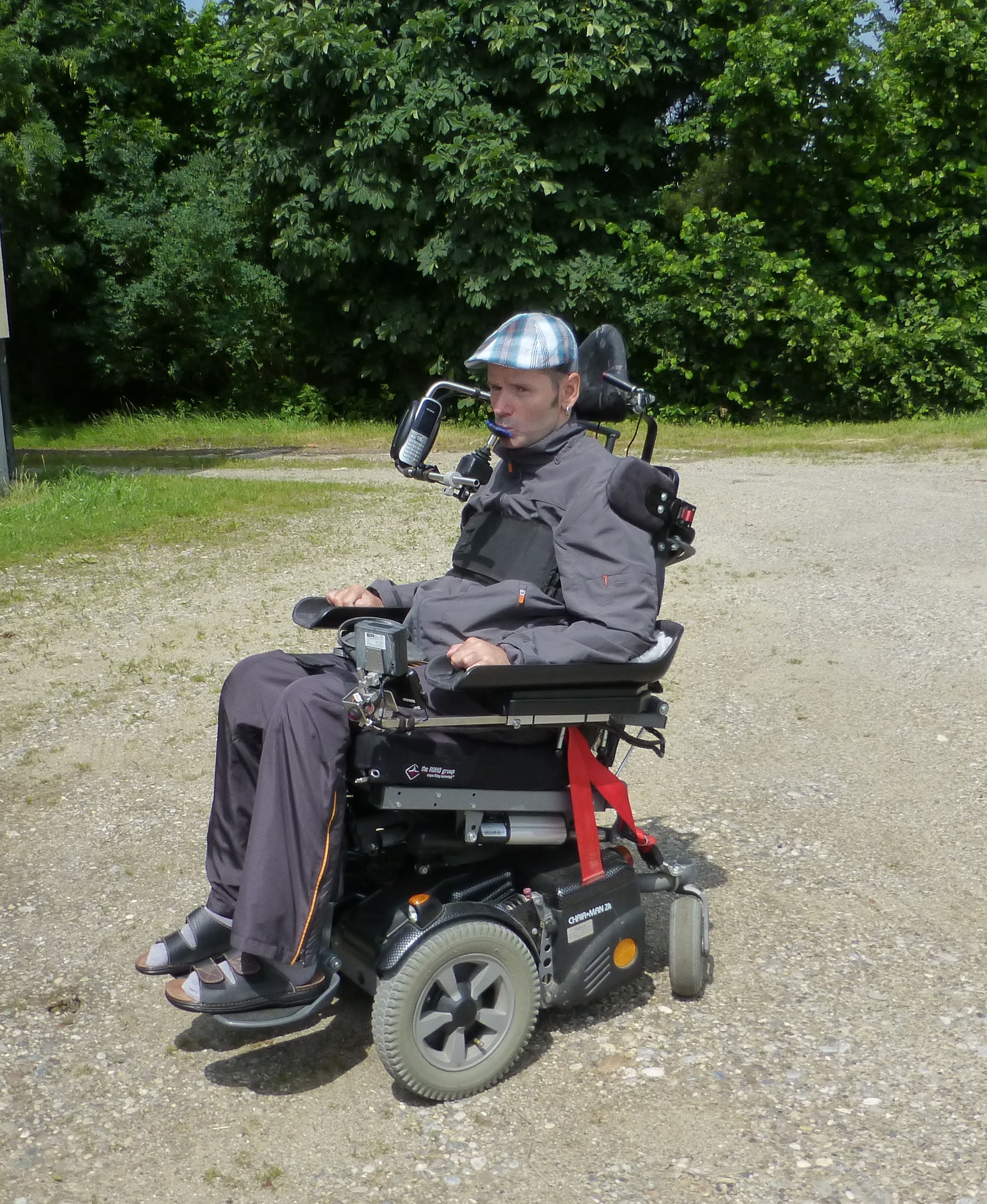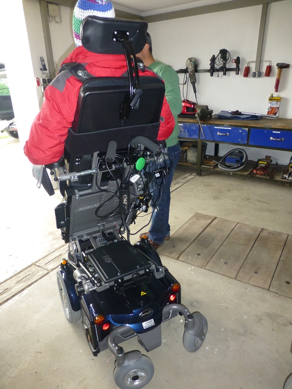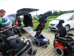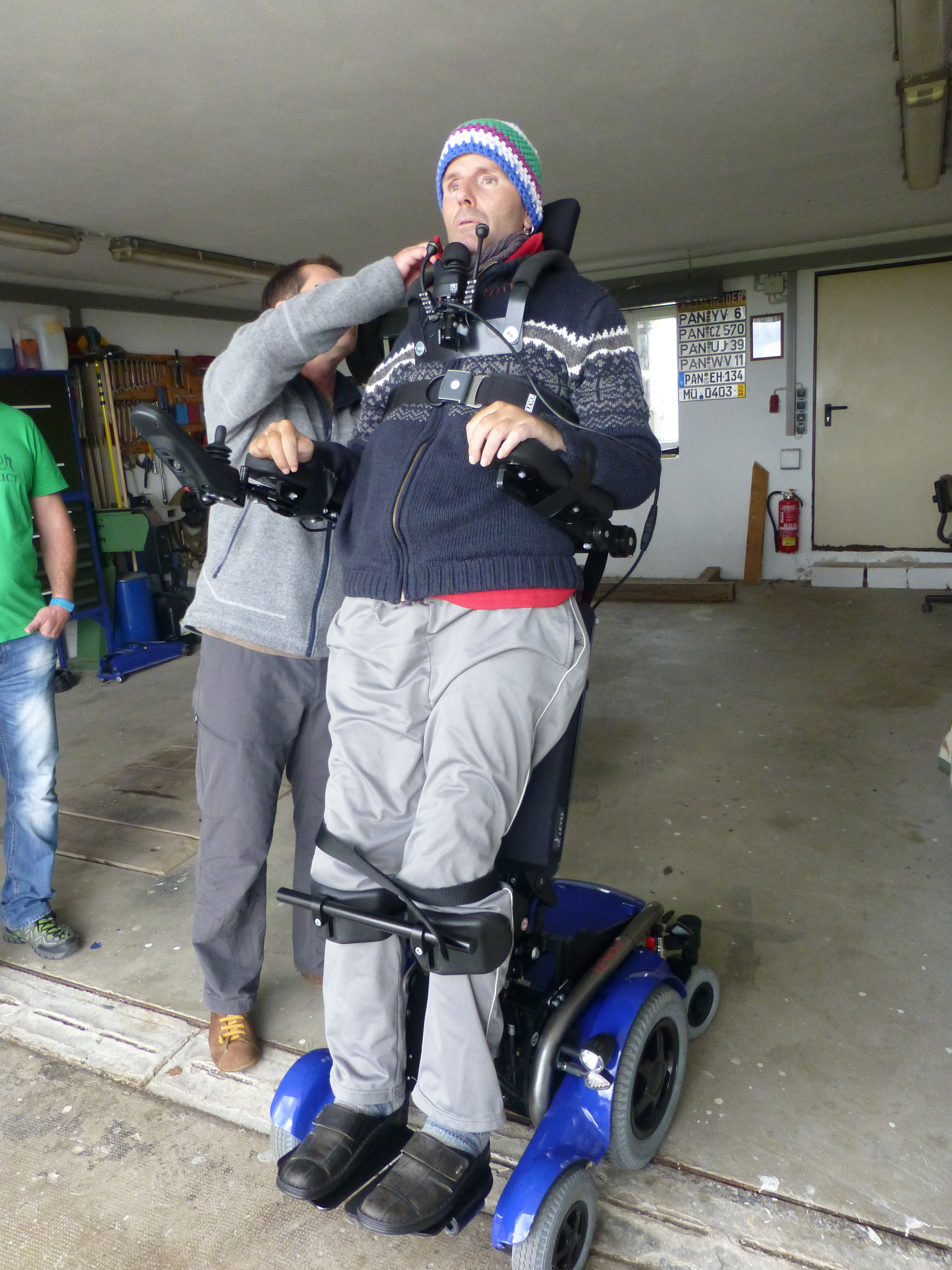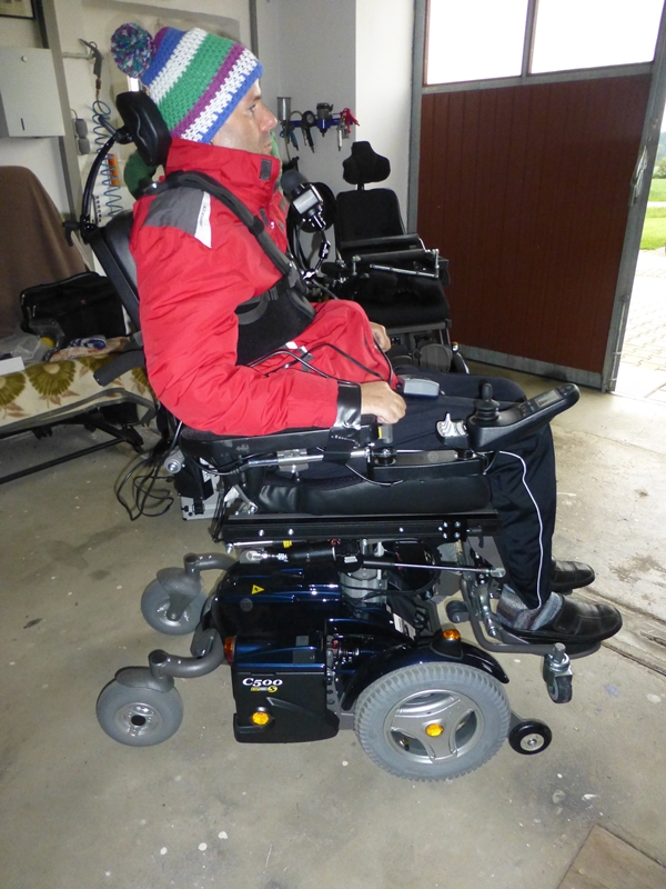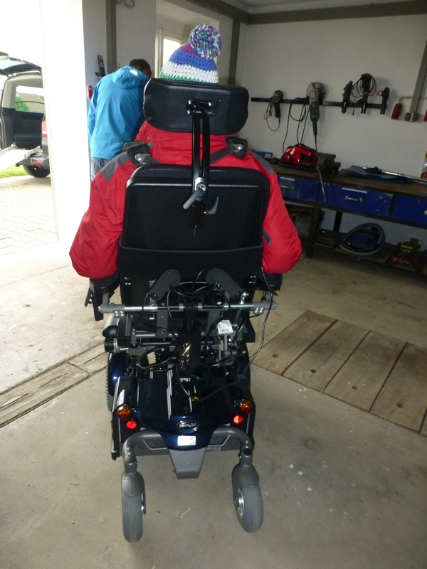 Jetzt musste ich mich nur noch entscheiden, aber eigentlich habe ich mich schon entschieden als ich den Permobil gesehen habe. Noch bevor ich hineingesetzt wurde (achtet auf meinen Gesichtsausdruck) oder ihn probiert habe. Von den Dingen, die der levo c3 nicht hat, ist das Schlimmste, oder besser gesagt fehlt mir, das der Permobil 12 km/h schnell fährt und der levo C3 „nur“ 10 km/h schnell. Am Anfang habe ich mir gedacht, wow, das ist aber schnell. Aber schon nach sehr kurzer Zeit hat man sich daran gewöhnt und möchte wieder schneller fahren. Aber jetzt zu den Dingen, die ich am neuen Rollstuhl haben wollte. Ein Handy oder Tablett, eine Rückfahrkamera, eine Bluetooth Maus und einen Spannungswandler von 24 V auf 12 V. Das war auch schon die ganze Sonderausstattung die ich mir wünschte.