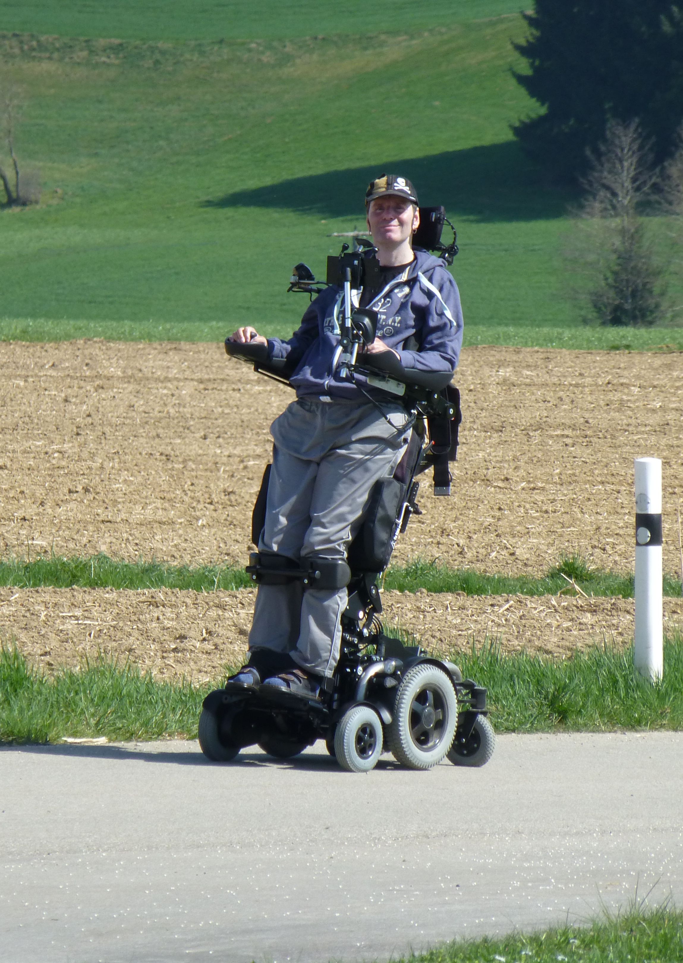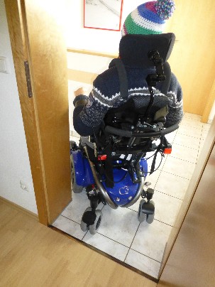 Wie ihr sehen könnt, kann ich mit diesem Rollstuhl alleine aufstehen. Auch ansonsten hat sich einiges an meinem neuen Rollstuhl geändert. Ich habe 2 angetriebene Achsen und insgesamt 8 Räder. Mein Vorgänger hatte eine angetriebene Achse und 4 Räder. Auch das Konzept ist etwas anders. Vorher hatte ich einen Vorderradantrieb und jetzt einen Mittelradantrieb. Beides hat vor und Nachteile. Beim jetzigen Mittelradantrieb bin ich viel wendiger. Beim Vorderradantrieb ist das Fahren etwas komfortabler weil die Achse nicht direkt unter meinem Stuhl montiert ist. Die Achse direkt unter meinem Stuhl leitet die Stöße/Unebenheiten der Fahrbahn direkter weiter.