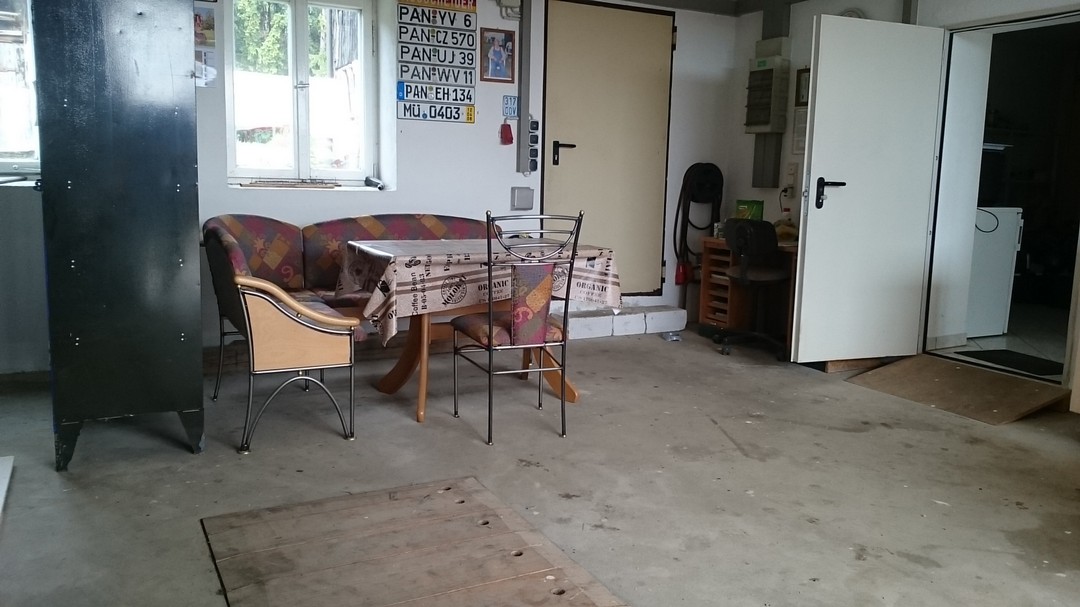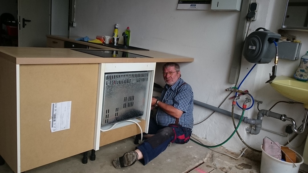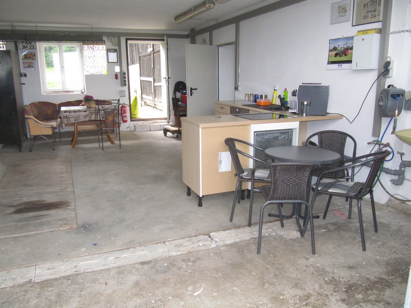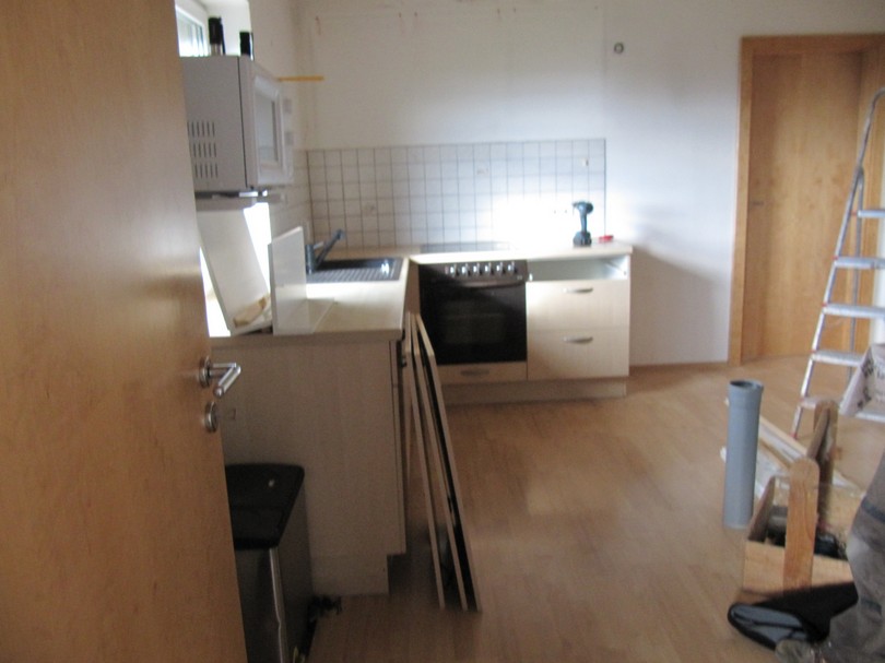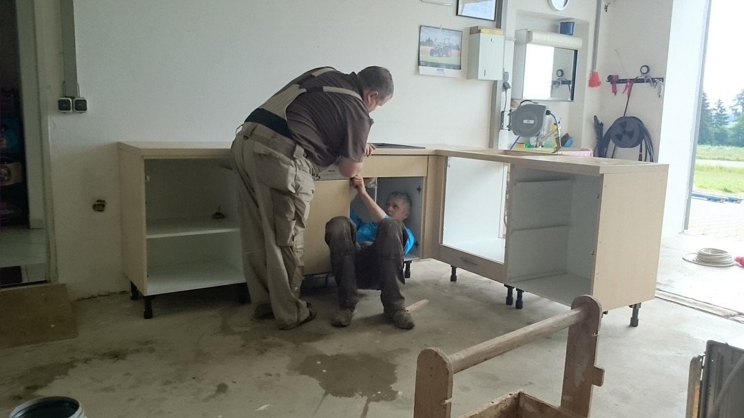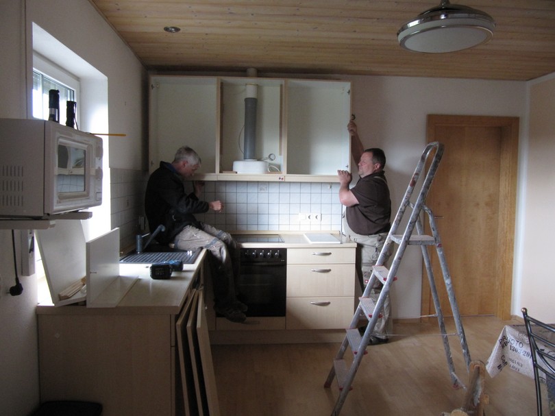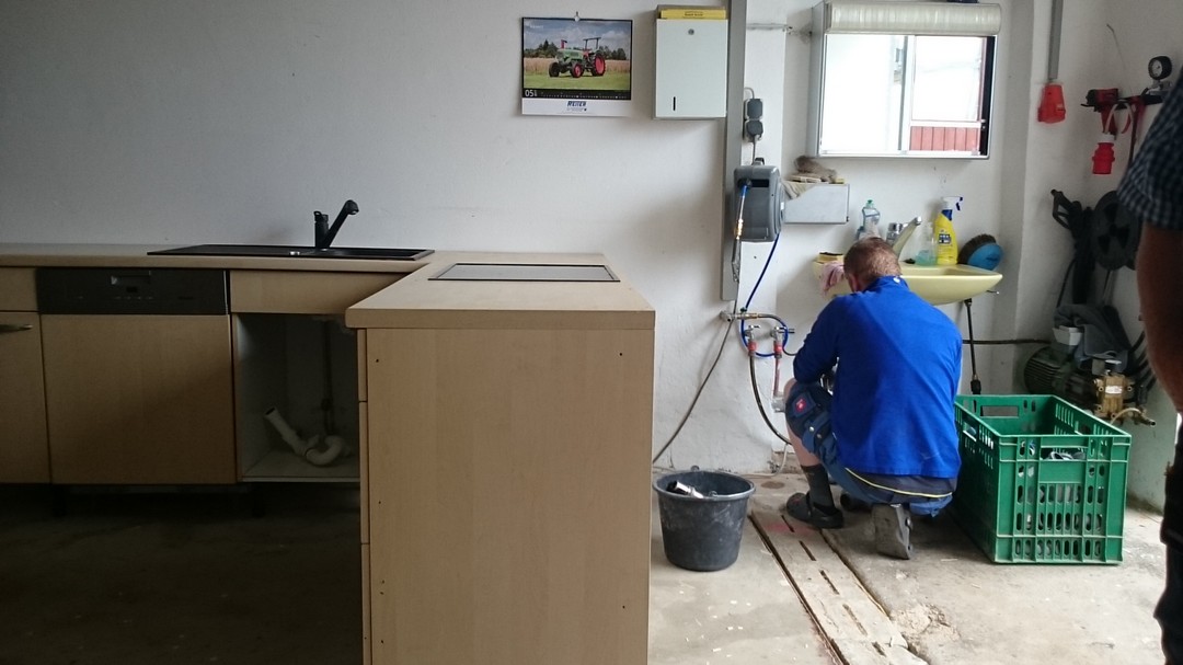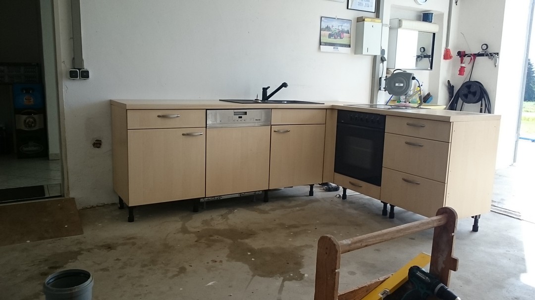 Während er geschätzten 3-4 Monate dauernden Baustelle brauchten wir natürlich einen Ersatz. Wir sind darauf gekommen dass die alten Küchenmöbel in der Werkstatt unten gut passen würden, mein Auto haben wir in die Traktorgarage geparkt und der arme Traktor musste draußen bleiben.