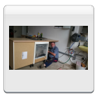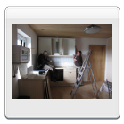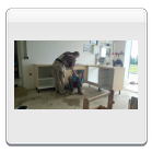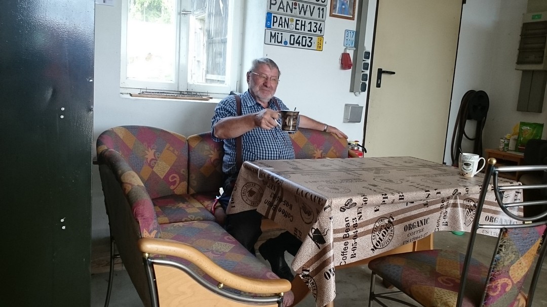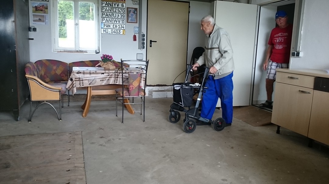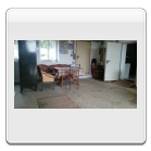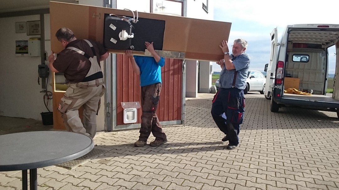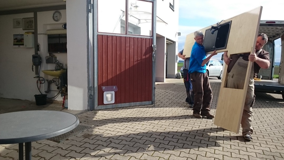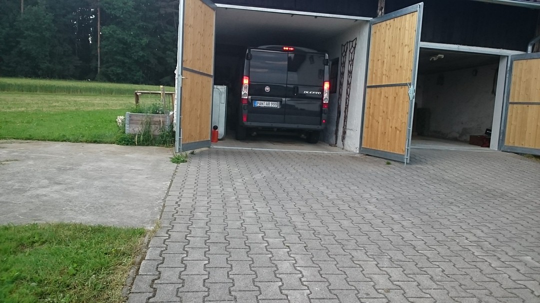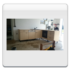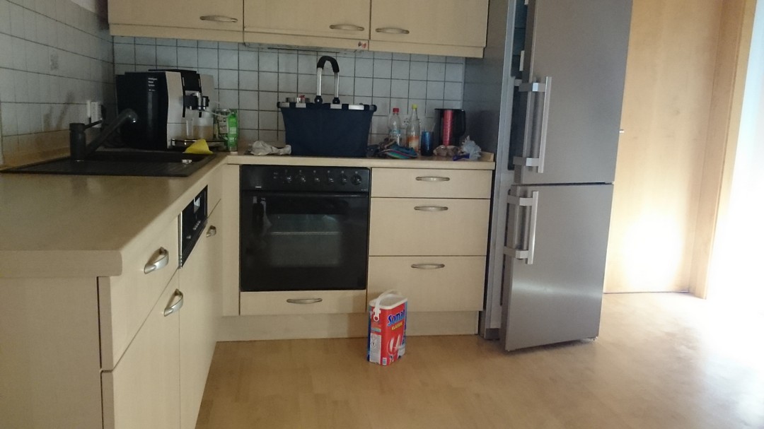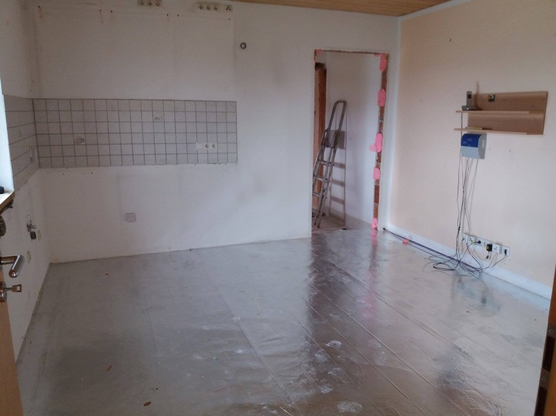 Während er geschätzten 3-4 Monate dauernden Baustelle brauchten wir natürlich einen Ersatz. Wir sind darauf gekommen dass die alten Küchenmöbel in der Werkstatt unten gut passen würden, mein Auto haben wir in die Traktorgarage geparkt und der arme Traktor musste draußen bleiben.