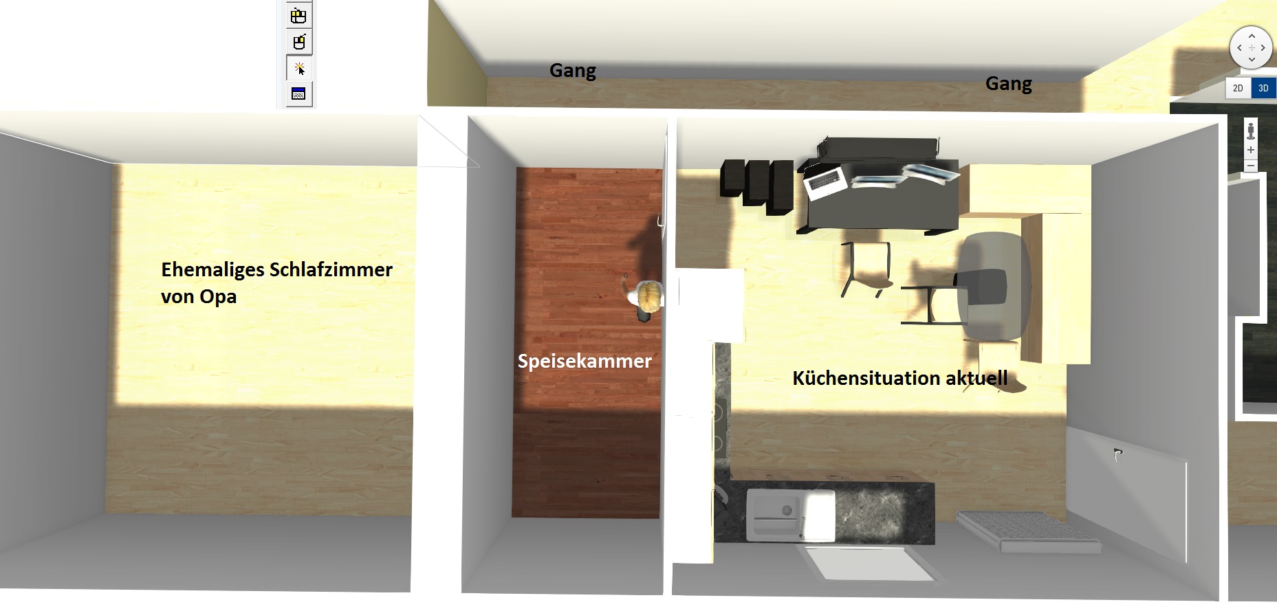 Die Idee dazu ist mir gekommen, nachdem feststand dass mein Opa, nach einem Oberschenkelhalsbruch, nicht mehr Treppensteigen kann. Sein Schlafzimmer liegt genau neben meiner Küche. Da mir meine Küche sowieso zu klein ist, habe ich ihn gefragt, ob ich das Zimmer haben kann, um meine Küche zu vergrößern.