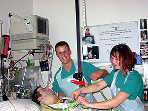 Das bin ich circa fünf Wochen nach dem Unfall. Die ersten zwei Wochen wurde ich sogar noch künstlich ernährt weil ich nichts essen konnte. Beim Unfall habe ich mir auch eine Rippe gebrochen die meine Lunge verletzt hat und es zur Lungen Einblutung gekommen ist. Bis sich meine Lunge und mein ganzer Körper soweit erholt hatten dass ich wieder selber Atmen konnte sind lange sieben Wochen vergangen. Das schlimmste war nicht einmal das man künstlich beatmet wurde sondern dass man, wenn man beatmet wird, nicht sprechen kann. Durch die Beatmung kommt keine Luft an die Stimmbänder und man kann nicht sprechen. Man muss sehr langsam und deutlich die Lippen bewegen, damit die Leute einem von den Lippen ablesen können.