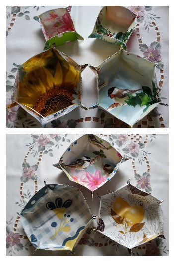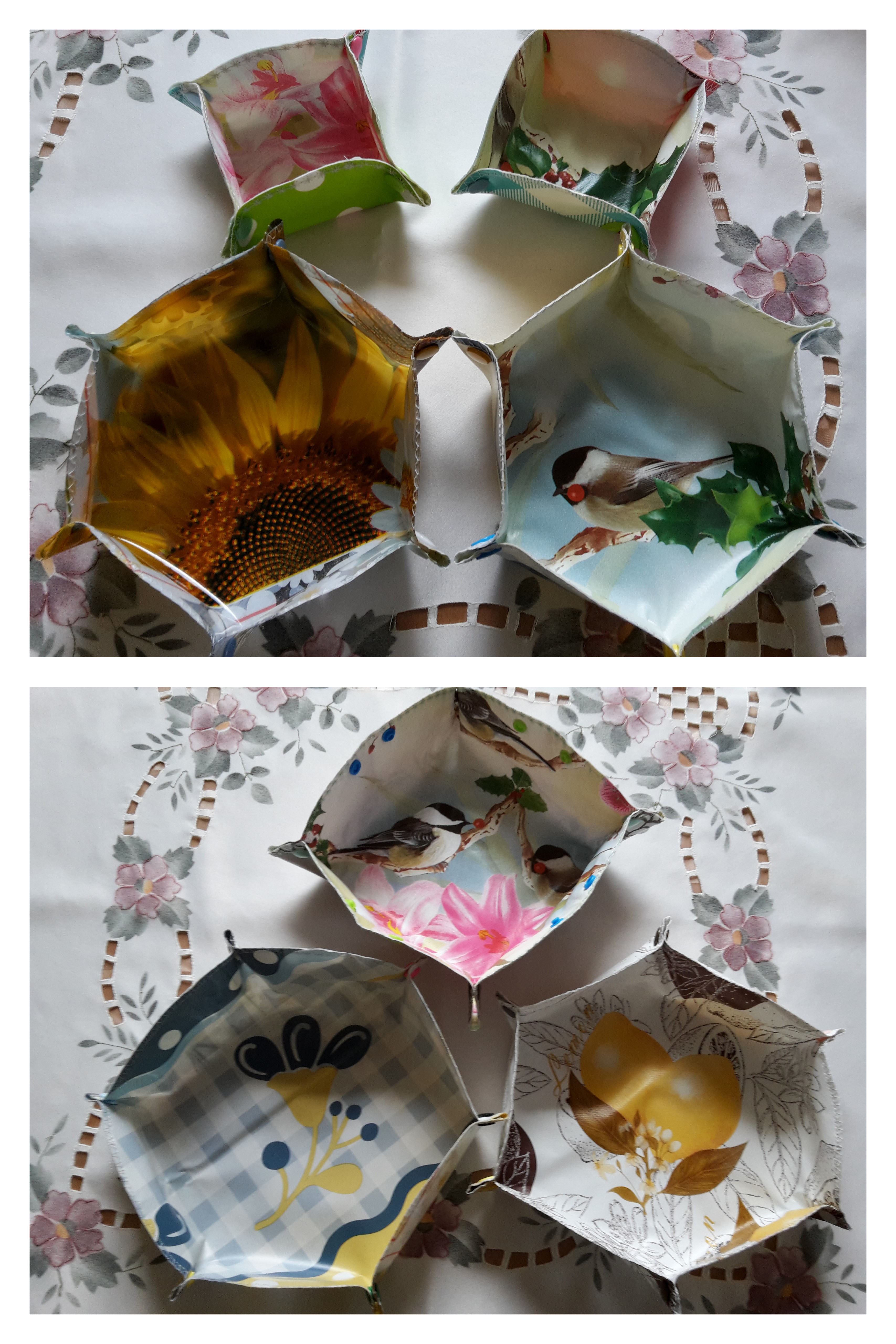 Plastikkörbchen mit Druckknöpfen aus Wachstuch, in verschiedenen Größen.